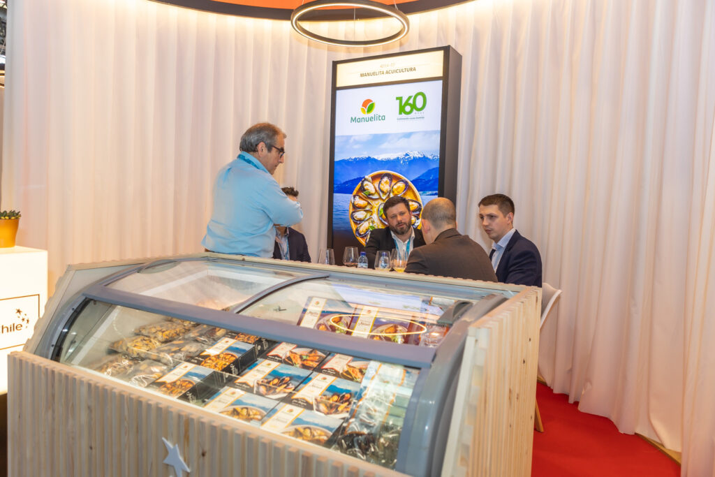 Chile participa con un stand en el que están presentes seis empresas exportadoras, que ofrecen productos como mejillones (choritos), salmón, jurel, abalón, centolla, entre otros pescados, crustáceos y mariscos, en distintos formatos, como congelados y conservas.